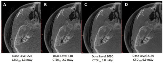 Display of image quality at 121 kV and pre-filtering of X-rays with 0.4 mm tin filter, rising dose levels from (A–D). Data sets with tin pre-filtration were rated as insufficient for preoperative imaging.