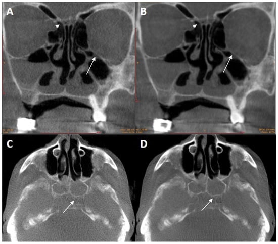 Difference between 121 kV/DL 278 (A,C) and 121 kV/DL 1090 (B,D). Note the better detail visibility of the bony structures in (B) (orbital floor: arrow; olfactory fossa: arrowhead) or in (D) (carotid canal: arrow).