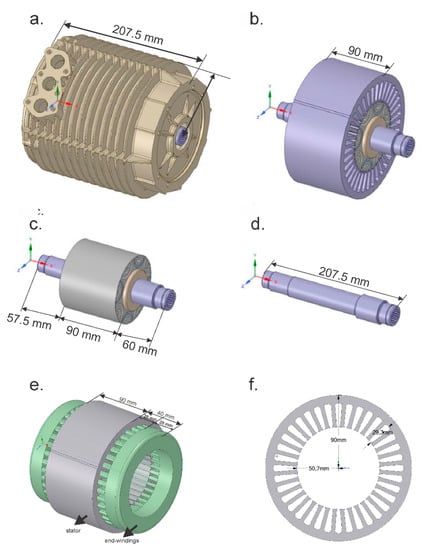 The 3D geometry of the interior permanent magnet IPM motor: (a) stator, rotor and shaft with the housing; (b) stator, rotor with magnets and the shaft; (c) rotor with magnets and shaft; (d) shaft only; (e) stator with windings; (f) dimensions of the stator lamination sheet.