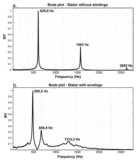 The results of the experimental measurement of modal natural frequencies identified on the stator stack without windings are displayed in Figure 5a, while the experimental results performed on the stator stack with the presence of the slot windings and end-windings are shown in Figure 5b.