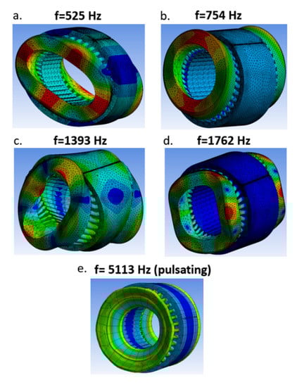 Front view of the 3D numerical model of the stator stack; calculated natural frequencies and their corresponding modal shapes: (a) m = 2, (b) m = 3, (c) m = 4, in (d) m = 8 and (e) m = 0 (pulsating mode). The normalized total deformations are indicated from minimum (blue color) to maximum (red color).
