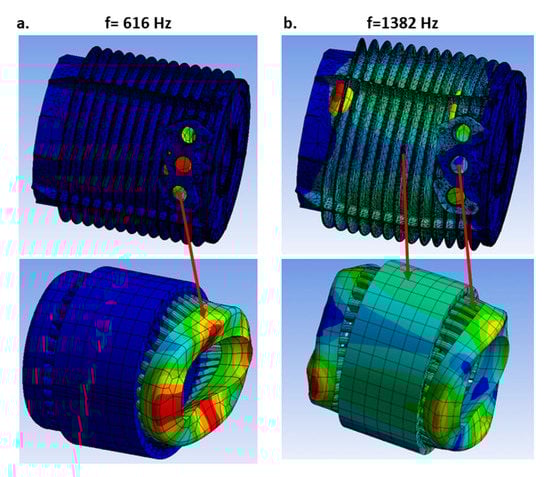 The modal analysis of stator and windings with the presence of the motor frame was also performed in order to investigate its influence on the natural frequencies of the inner structures as well as to investigate the resulting natural frequency of the whole motor assembly. The results displayed in Figure 8 show that the presence of the motor frame, front and back ending, increases the natural frequencies of the whole motor assembly (i.e., the motor frame, front and back ending, stator stack and windings). The results were obtained with the final mesh density consisting of 324,440 finite elements and 597,323 nodes. Mechanical vibration energy is transmitted from the inner structures (predominantly stator stack) to the motor frame and fins, and can be detected as audible noise and vibration. From Figure 8b, the vibrations can be visually seen. This probably means that they can be easily detected by measurement on the real machine. The first frequency at which the motor frame will start vibrating occurs at f = 1382 Hz (Figure 8b), which is also the first detectable natural frequency of the stator stack vibration. Our results show that the motor frame will vibrate only if the stator stack vibrates. The presence of the motor frame will increase the natural frequency of the whole assembly; however, it cannot prevent the separate vibrations of the end-windings at lower frequencies, which are not detectable from the motor frame, as shown in Figure 8a. These results shown in Figure 8a show that at the frequency f = 616 Hz, the end-windings vibrate while the motor frame does not vibrate due to low energy transmitted from the inner structures (stator and windings). Therefore, the end-winding in close proximity to the machine cover vibrates at the frequency f = 616 Hz, which is not detectable if only the stator frame vibration is observed. This effect may result in undesirable mechanical damage of the windings and premature failure, although it is not detectable on the motor frame. This also means that the vibration, which is not in the audible specter, needs to be adequately mitigated. It is therefore necessary to perform detailed modal analysis of the inner structures as well in order to evaluate the vibration extent of all components and thus to design a safe and low vibration motor structure.