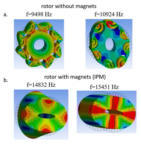 The numerically calculated natural frequencies and their corresponding modal shapes are shown in Figure 9. The modal shapes at two different frequencies calculated in the proximity of the measured ones are displayed for each configuration. The modal shapes for the IPM rotor without magnets are displayed at the exiting frequencies f = 9498 Hz and f = 10,924 Hz (Figure 9a, the results were obtained with the final mesh density consisting of 48,791 finite elements and 86,253 nodes). The modal shapes for the IPM rotor with the magnets are displayed at f = 14,832 Hz and f = 15,451 Hz (Figure 9b; the results were obtained with the final mesh density consisting of 54,901 finite elements and 118,299 nodes).
