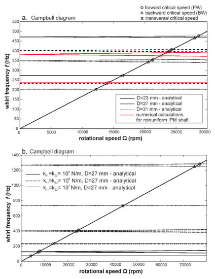 Comparison of Campbell diagrams and critical speeds: (a) analytically calculated for different shaft diameters and the numerical results for the real non uniform IPM motor shaft geometry (all the calculations are done for the bearings stiffness k11 = k22 = 106 N/m) and (b) analytically calculated for different properties of bearings (all shafts are L = 207.5 mm long).