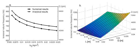 Figure 14 shows the comparison of the analytical and numerical solutions for a simple two-disc rotor system (illustrated in Figure 3) where the first and second disc represent the rotor and the load, respectively. The calculations were done for the different polar masses of inertia of the load Ip2 spanning the range 0.005 kg·m2 < Ip2 < 0.025 kg·m2, while the rotor polar mass of inertia was kept constant at Ip1 = 0.0048 kg·m2 (i.e., equal to the Ip1 of the real/prototyped IPM rotor). The observed difference between the analytical solution (Equation 27) and the numerical results was 5% (Figure 14a), which validated the numerical results (the 5% difference complies with API standards required for a torsional system design []). The results in Figure 14a also show that the torsional natural frequencies decrease with the increase of the polar mass of inertia of the load Ip2. The investigation results shown in Figure 14b indicate that the torsional natural frequency of the shaft can be increased by increasing the shaft diameter and decreasing the shaft length.
