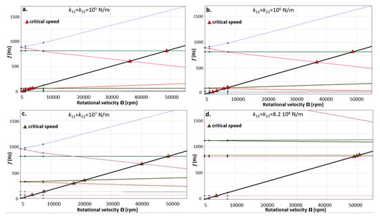 Critical speeds of the IPM rotor with the load represented in Campbell diagrams numerically calculated Figure 9. (a) k22 = 105 N/m, (b) k11 = k22 = 106 N/m, (c) k11 = k22 = 107 N/m, and (d) k11 = k22 = 8.2 × 108 N/m.