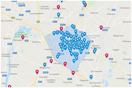 The traffic sensors used in Modena are induction loops that are insulated electrically-conducting loops installed under the road surface. A lead-in cable connects the loop to the detector, which is an electronic unit that detects the presence of vehicles above the loop. In these sensors, the vehicle passing over the sensor is registered by an increase in inductance. An induction loop can be located in a specific lane of a street to count the number of vehicles passing over it in a specific direction. In Modena there are 400 induction loops (see Figure 1). Three hundred forty-six induction loops are managed by the City Council (the blue markers in Figure 1) and are distributed around the city center, on almost every road of junctions with traffic lights. In contrast, 54 induction loops are placed on regional and municipal roads under the control of the Emilia Romagna Region (the magenta markers in Figure 1). Sensors provide, along with the identifier of the sensor, the number of vehicles passing over the sensor during a time interval, the timestamp of the beginning of the time interval, and the average speed.