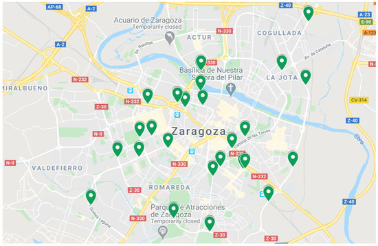 - Traffic static devices, which are 46 devices installed in different positions of the city of Zaragoza. More specifically, they are inductive coils located under the asphalt. These devices provide data about the traffic for 24 h a day for all the days in a year. Usually, there are two devices on the same road, one for each direction of circulation. However, in a few exceptions (specifically, for two cases), there is only one device measuring the traffic in just one direction. In Figure 2, a representation of the positions of these sensors is provided (shown with green markers).