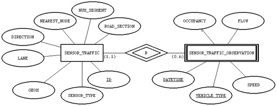 The two entity types used to model the information related to traffic sensors are illustrated in the entity/relationship (E/R) diagram shown in Figure 3, based on Chen’s notation [60]. The corresponding “SENSOR_TRAFFIC” table stores the identifier of the sensor (ID), its type (SENSOR_TYPE), its position as a point data type of PostGIS (GEOM), the identifier of the street in OpenStreetMap (OSM) in which the sensor is located (ROAD_SECTION), the sequential number of the specific piece of a street (segment) with the sensor (NUM_SEGMENT), the OSM node which is the closest one to the sensor (NEAREST_NODE), the direction of the vehicles counted by the sensor (DIRECTION, which is true if it is the same specified by the order of the nodes mapped on the street in OSM and false otherwise), and the sequential number of the lane in which the sensor is located (LANE, where the value zero indicates the rightmost lane in that direction). The measurements of the sensors are stored in the “SENSOR_TRAFFIC_OBSERVATION” table. In particular, the identifier of the sensor (ID), the beginning of the sampling interval of the observation (DATETIME), and the type of vehicles the measurements are related to (VEHICLE_TYPE), all compose the primary key of the table. For the sensors that are not able to categorize the type of vehicle, the value of VEHICLE_TYPE is “unknown”. The other attributes are the number of vehicles counted by the sensor (FLOW), the average speed (SPEED), and an optional occupancy rate attribute (OCCUPANCY, which is an estimation of the time a vehicle is above the sensor). The observation rates can have different values, according to the model of the sensors and their configuration. “SENSOR_TRAFFIC_OBSERVATION” is a weak entity type (its total participation in the relationship R is shown in Figure 3 using the notation proposed by Elmasri and Navathe [61]) that depends on “SENSOR_TRAFFIC”; its primary key is composed by the attributes DATETIME, VEHICLE_TYPE and also the ID of the corresponding SENSOR_TRAFFIC. Notice that Figure 3 only represents a small fragment of the TRAFAIR database (the part related to traffic sensor observations).