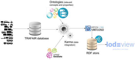 The conversion of the data about traffic sensors and the measurements they take over a long period into Linked Data is within the scope of the TRAFAIR project. The approach implemented for this purpose is shown in Figure 4 and will be detailed in this section. Data related to the general information about the sensors and their measurements are stored into the TRAFAIR database. The tool Karma [62,63] takes this data as input in CSV format and transforms it into Linked Data by using appropriate ontologies and by exploiting the Linked Geo Data ontology [64] for mapping the information of OpenStreetMap. The Linked Data produced by Karma is automatically loaded into a SPARQL endpoint, which is queried by the visualization tool called Lodview [65].