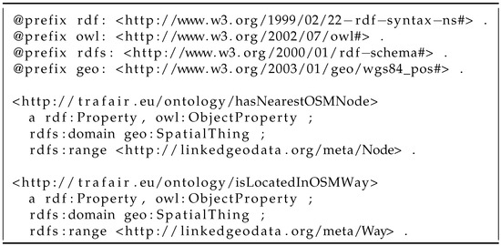 The content of the “road_section” attribute has been concatenated to the link http://linkedgeodata.org/triplify/way; therefore, if the value of the “road_section” attribute is “387989963”, then it becomes http://linkedgeodata.org/triplify/way387989963, which is a dereferenceable object in the Linked Geo Data Knowledge Base [64]. The same approach has been used for the attribute “nearest_node”, adding the link http://linkedgeodata.org/triplify/node to the identifier of the node, which is another element of OSM. Two new properties have been defined to connect a sensor to its way and its nearest node, called trafair:isLocatedInOSMWay and trafair:hasNearestOSMNode, respectively (see Figure 5). Moreover, the name of the city where the sensor is located has been added. The city has been identified by exploiting the class dbo:Place of the DBpedia Ontology [69], and the property dbo:Location to link the instance of the class dbo:Place to the traffic sensor.