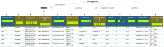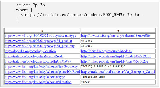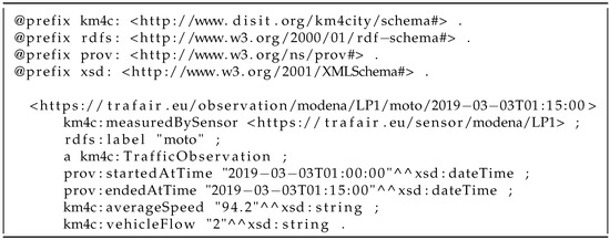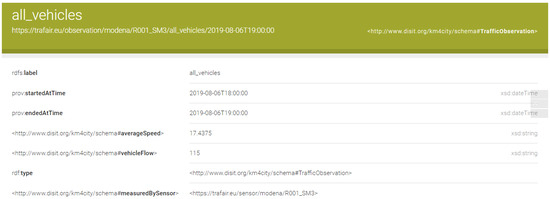 Concerning the “sensor_traffic_observation” entity type in Figure 3, the Km4City ontology has been exploited. Each instance of this entity type represents an observation made by one sensor. An instance of the class km4c:Observation identifies the observation. Since the primary key of the corresponding “sensor_traffic_observation” table is composed of three attributes (identifier of the sensor, timestamp indicating the beginning of the observation, and type of vehicles observed), the URI of each observation has been created as the concatenation of the values of these attributes. The property km4c:measuredBySensor has been used to connect the observation to the sensor, while the properties km4c:vehicleFlow and km4c:averageSpeed have been exploited to indicate the number of vehicles and their average speed, respectively. The property rdfs:label has been used to represent the type of vehicles, which is enough for representing the names of the types of vehicles; as an alternative, an existing ontology of vehicles, like the Vehicle Ontology or the Vehicle Sales Ontology, could have been extended (it should be noticed that the Vehicle Ontology available at https://enterpriseintegrationlab.github.io/icity/Vehicle/doc/index-en.html does not currently define subclasses of the concept “Vehicle” and that the Vehicle Sales Ontology available at http://www.heppnetz.de/ontologies/vso/ns does not cover all the types of vehicles managed in TRAFAIR; however, new concepts can be added as needed).