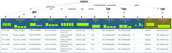 The graphical user interface of Karma has been used to create two models: one for each table. In Figure 7, a graphical representation of the model used to map the attributes of the “sensor_traffic” table is provided, while the mapping in Figure 8 is related to the “sensor_traffic_observation” table. Karma requires some input data to create the model; however, it is not necessary to develop the model importing the whole amount of data from the table. For this reason, initially, some exemplar tuples from the corresponding tables of the TRAFAIR database have been imported by configuring the connection to the database and using the appropriate query. Then, the selected ontologies have been uploaded and each attribute has been manually mapped to the suitable class/property. Once the mapping is concluded, the R2RML models that can be applied to a larger dataset were downloaded by using the Karma RDF Generation Service [74]. This service allows generating RDF data and publishing it on a SPARQL Endpoint. The information required for the transformation is the path of the file containing the data to be transformed (allowed formats are CSV, JSON, XML, and Excel), the URI of the R2RML model, the SPARQL endpoint, and the graph URI where the RDF data will be published.