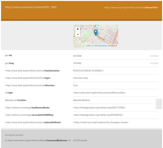 An example of the use of LodView is shown in Figure 9. Here the information of the traffic sensor “R001_SM3” is described: the position of the sensor is visualized on a map while other information is displayed as property-object pairs. At the bottom of the figure, the inverse relationships are listed. Figure 10 shows one of these relationships, which represents the observation made by the sensor “R001_SM3” on the 6th of August 2019 from 19:00 to 20:00.