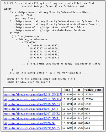 As of Virtuoso 7.1, several improvements have been made to integrate the support of geospatial queries. Indeed, Virtuoso can understand representations for several types of geometric objects (points, linestrings, multilinestrings, polygons, multipolygons, and geometry collections). Besides, it supports several functions with geospatial objects, increasing compliance with GeoSPARQL and OGC (Open Geospatial Consortium) standards. Figure 12 shows an example of a GeoSPARQL query, which selects the number of vehicles counted by the sensors placed in the town square of Modena on 8 January 2019.