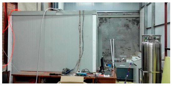 Considering the blade rotor size and wall effect, the environmental chamber, as shown in Figure 1, was made. The size of the environmental chamber was 3 m long, 3 m wide, and 2 m high, and the outer wall material was phenolic foam insulation board with better adiabatic property. In order to detect the temperature distribution inside the environmental chamber, we installed several temperature sensors on the inner wall. The temperature sensor adopts thermocouple, and its measurable temperature range can reach −40 °C. In the experiment, liquid nitrogen was put into the environmental chamber to achieve the purpose of refrigeration. The input quantity of liquid nitrogen was controlled by the control valve to keep the temperature inside the environmental chamber at the expected value. The icing temperature was controlled within ±1 °C in the icing process.