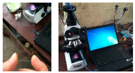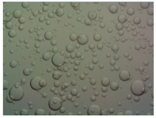 In the study of aircraft icing, the mean volume diameter of droplets (MVD) is usually used to represent the droplet diameter. In the experiment, a relatively simple and reliable statistical method was used to measure the droplet diameter. A thin layer of silicone oil was applied on the surface of glass slide, as shown in Figure 2. The glass slide coated with silicone oil was placed in the spray range of nozzles to collect a certain number of droplets. Due to the incompatibility between oil and water, the droplets were wrapped in silicone oil and keep original shapes for a short time. The droplets on the glass slide were observed and photographed under a high-power microscope; the observation results are shown in Figure 3. The MVD can be obtained by statistical calculation of droplet diameters.