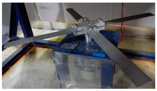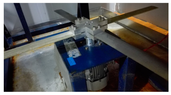 As shown in Figure 4, the blade diameter was 85 cm and chord length was 5 cm. The blade section was NACA0012 airfoil and the blade shape was rectangular without torsion. The blade materials included steel and composite material, and the number of blades on the rotor was four. As shown in Figure 5, the blade and rotating mechanism were driven by an alternating current motor. During the experiment, the rotation speed was controlled by adjusting the motor frequency. In order to accurately obtain the rotation speed, we installed a Hall switch element on the blade hub to measure the rotation speed.