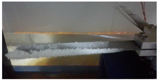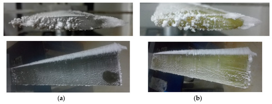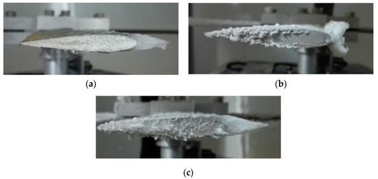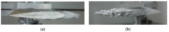 In order to study the effect of icing temperature on rotor blade icing, we compared the experimental results of cases 1, 2, and 3. Figure 7 shows the ice shapes under cases 1, 2, and 3. It can be seen that different icing temperatures led to different ice types. Figure 7b shows the ice shape at −5 °C. This is known as glaze ice, and the ice shape was typical horn ice. The amount of ice near the stagnation point was relatively small, while the icing on the upper and lower sides was thicker. This was because when the icing temperature is high, the liquid water collected on the blade surface flows to upper and lower sides under the action of surrounding airflow and freezes gradually. The ice shape at −15 °C is shown in Figure 7c. The icing mainly accumulated near the leading edge, and the ice thickness was the largest near the stagnation point. This was a case of rime ice, which is white and opaque in appearance. The droplets froze rapidly after impacting on the surface, and there was no liquid water flowing on the surface. Figure 7a shows the rotor icing at −10 °C. Although icing also occurred near the leading edge, it was more transparent in terms of its appearance. This ice type has the common characteristics of glaze ice and rime ice, and is known as mixed ice. It can be seen that the trend of experimental results was the same as the theoretical analysis, which indicates that there are different ice types in rotor blade icing under different temperature conditions, which should be considered in the design of rotor anti-icing and de-icing systems.