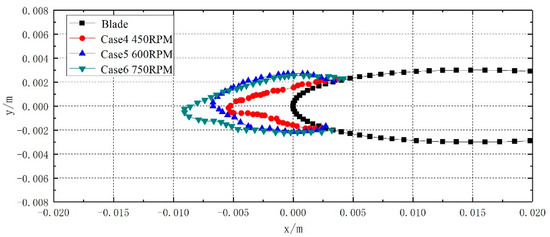 The experimental results of cases 4, 5, and 6 were compared to study the effect of rotation speed on blade icing. In Figure 8, the experimental results under three conditions are given, and the comparison of ice shapes is shown in Figure 9. It can be seen that under the conditions of similar LWC, with the gradual increase of rotation speed, the ice thickness at the leading edge of the blade increased. This was because the increase of rotation speed led to the increase of linear velocity at the same position of the blade, and the number of droplets impacting on the surface increased in unit time. At the same time, the impact velocity of droplets had a corresponding growth relationship with the droplet collection efficiency. Therefore, the amount of ice increased with the increase of rotation speed.