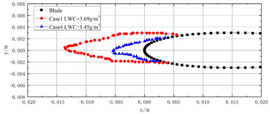 The change of LWC had an obvious influence on the amount of ice. The ice shapes of cases 1 and 4 were compared, as shown in Figure 10. The result showed that with the increase of LWC, the amount of ice also increased. This was because the increase of LWC led to the increase of the mass of collected water and frozen ice at the same time. From a quantitative point of view, the amount of ice was almost proportional to the LWC under different conditions. Therefore, the most severe icing conditions with the most LWC should be considered in the design of an ice protection system to ensure the effectiveness of the system.