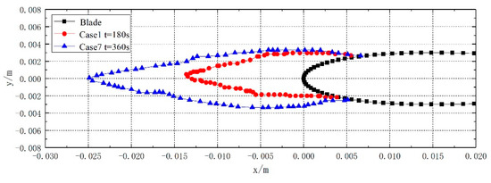 The icing experiments were carried out under cases 1 and 7, including different icing times. The icing times were 3 min and 6 min, respectively, and the comparison of ice shape is shown in Figure 11. With the increase of icing time, the ice shape and ice thickness increased. When the icing time was longer, the ice thickness of the upper and lower sides changed little, but the ice thickness of the stagnation point clearly increased. This may have been due to the change of the original blade shape by icing, resulting in the change of droplet impingement area and icing range. For the iced rotor blade, the ice thickness near the stagnation point of the leading edge increased, while the droplets collected on the upper and lower sides decreased. The liquid water on the surface flow may have been affected by gravity, and thus there was more liquid water flowing along the lower surface, resulting in the ice thickness of the lower surface being greater than the upper surface, as shown in Figure 11. This also explained how it was necessary to use a multi-time step method to simulate rotor icing in numerical calculations. In the multi-time step method, the changes of air flow field, droplet field, and icing rate can be considered during the process of ice accretion, and the icing can be simulated more accurately.