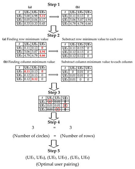 In the first step, the cost matrix m is formulated. Each user data rate or energy efficiency is first calculated, accompanied with the estimation of the total data rate (Mbps) or total energy efficiency (Mbits/Joule) that is assigned to the two users within the cost function (Ws,w represents the total data rate, and Es,w represents the total energy efficiency for strong and weak user pairings). The main aim is to maximize the user’s sum rate and energy efficiency. Therefore, the largest possible value is first determined and then deducted through the whole cost matrix (Ws,w or Es,w). Table 1 and Table 2 illustrate the Ws,w and Es,w for 10 Users (UEs) available in the BS. The size of rows and columns is decreased by determining the minimum value in each of them in the second step. The determined value is deducted from corresponding row or column.