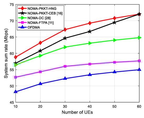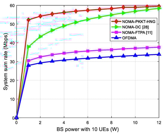 Figure 3 demonstrates the effect of the BS’s transmission power on system sum rate with 10 users considered in the BS and with transmission power variation from 1 to 12 W. The sum rates of NOMA-PKKT-HNG and NOMA-DC are considerably higher than those of NOMA-FTPA and conventional OFDMA due to the power optimization. The results show that the system sum rate increases upon increasing the BS’s transmission power for all applied methods. The NOMA-PKKT-HNG technique achieves a higher sum rate than NOMA-DC [], NOMA-FTPA [] and conventional OFDMA. Figure 4 shows the system sum rate performance with different UE numbers (10–60 users per BS that has 1 W transmission power). The results confirm that the system sum rate increases as the number of users increases. For comparison, the NOMA-PKKT-HNG is compared with NOMA-PKKT-CEB, a centralization-based approach []. The proposed technique outperformed other techniques (NOMA-PKKT-CEB, NOMA-FTPA and OFDMA) under the same applied method for power allocation in both proposed NOMA-PKKT-HNG and NOMA-PKKT-CEB techniques with similar sum rate for all users available at the BS. Once 20 users exist at the BS, the NOMA-PKKT-HNG has the highest performance when compared to other techniques.