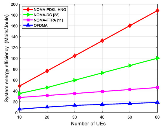 For evaluation, the simulation results are obtained using MATLAB software (8.5.0, MathWorks, Natick, Massachusetts, USA). The single-cell downlink NOMA system with the BS’s transmission power (Pmax) of 41 dBm and the circuit power consumption (Pc) of 1 W is considered. The BS is located at the center of a circle with radius R = 500 m, and there is a random distribution of M users in the cell coverage. To reduce computational complexity, NOMA assigns only two users to each subchannel, and OMA assigns a single user to each subchannel. The CSI is known at the BS. The minimum distance between BS and users is 50 m, and the minimum distance between users is 40 m. The bandwidth of the NOMA system (Bw) is 5 MHz and the path-loss exponent β = 2. The noise power , and the power spectral density N0 = –174dBm/Hz. The obtained results are compared with OFDMA, FTPA [] and the DC algorithm [].