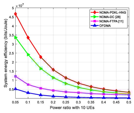 Figure 5 expresses the relationship between the system energy efficiency and the number of users available in a cellular system. The BS transmitting power is fixed at 1 W, and the system energy efficiency increases with the increasing number of users across all methods. The proposed NOMA-PDKL-HNG method is more energy-efficient than NOMA-DC, NOMA-FTPA and OFDMA. With 20 users at the BS, the system energy efficiency of the NOMA-PDKL-HNG technique is greater than those of NOMA-DC [], NOMA-FTPA [] and OFDMA by 0.66, 1.44 and 5.85 times, respectively. The system energy efficiency performance versus the BS transmit power to circuit power (PBS/Pc) ratio is shown in Figure 6. The BS transmit power is set at 12 W and the circuit power is set at 1 W with only 10 users available at the BS []. The results show that the energy efficiency decreases gradually as the power ratio increases because the energy efficiency is inversely proportional to power. NOMA-PDKL-HNG achieves higher energy efficiency when the power ratio is low and decreases faster upon power ratio increment