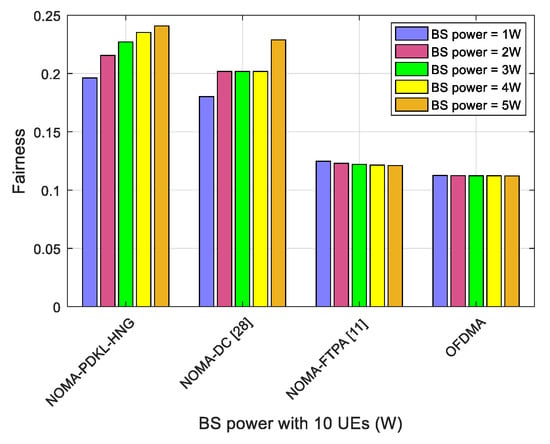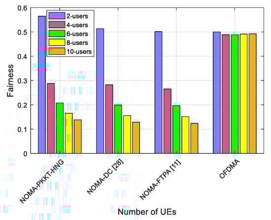 Figure 7 shows the effect of the varying the number of users on fairness performance. The BS transmit power is set to 41 dBm with only 10 users available at the BS []. In a two-user case, the NOMA-PKKT-HNG has the highest fairness compared to all other schemes. The fairness trend decreases as the number of multiplexed users in the subchannel increases. With four users, the fairness of NOMA-PKKT-HNG shows better performance than NOMA-DC [] and NOMA-FTPA [] by 1.94%, and 8.51%, respectively. However, the fairness performance of OFDMA remains constant regardless of the variation of the number of users in the system because the power is always assigned equally between the users.