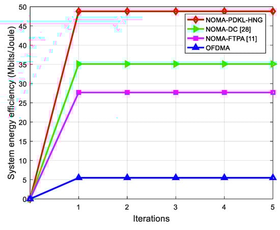 Figure 8 illustrates the fairness index with BS power variation from 1 to 5 W. The BS power with 10 users is considered. In contrast to other approaches, the fairness of the NOMA-PDKL-HNG technique increases as power transmission increases. This is due to the increment of the allocated power per user, which increases their data rate and fairness. In NOMA-DC, it can be shown that fairness is unstable: the fairness is the same from 2 to 4 W and increases at 5 W. The fairness of NOMA-FTPA is slightly higher than that of conventional OFDMA, with almost the same fairness even upon the increment of transmit power. Figure 9 depicts the system energy efficiency with a different number of iterations. The system has a 1 W BS power and a maximum number of 10 UEs. It is shown that NOMA-PDKL-HNG achieves high energy efficiency at all iterations compared to other methods. This is because the pairing process is achieved with optimal pairing process, and power is assigned to the users with less complex mathematical formulation. The optimal performance for all methods is obtained immediately after the first iteration.