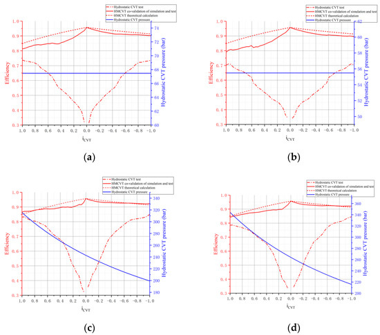 Figure 10. The range of transmission ratio, in four matching patterns. (a) The transmission range of pattern a; (b) The transmission range of pattern b; (c) The transmission range of pattern c; (d) The transmission range of pattern d. - From the Equations (26), (27), (29), and Figure 11, and are independent of , and only related to . Schemes 2, 4, and 6 exist as the work condition with the lowest transmission efficiency because mechanical transmission occurs in backward power recirculation, i.e., , as shown in Figure 6. The transmission efficiency of matching patterns b, c, and d are lower than matching pattern a because and mechanical transmission occurs even in backward power recirculation, as shown in Figure 6. Therefore, the efficiency of HMCVT is significantly reduced.