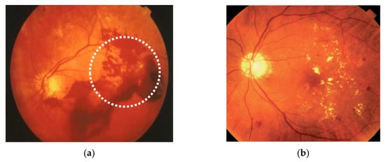 (a) Large numbers of dark floaters or cobwebs indicated the appearance of vitreous hemorrhage before treatment; (b) multiple symptomatic vitreous opacity gradually disappeared as perceived intraocular blood clots after 3 months of treatment.