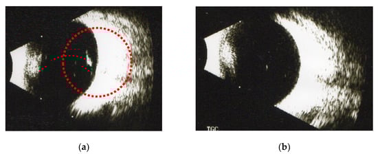 (a) One symptomatic vitreous opacity was found under B-scan before treatment. (b) The symptomatic vitreous opacity disappeared significantly as observed by ultrasound after 3 months of treatment with fruit collagenase supplements.
