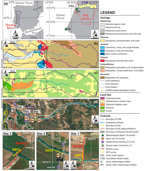 The study area is located at the outlet of the CSB (08°38′–08°47′ W, 38°05′–38°07′ N) in the southwest coast of Portugal (Figure 1a). The CSB covers an area of 31.5 km2, has a mean elevation of 230 m a.s.l. (outlet is 2 m a.s.l. on the West and peak elevation is 290 m a.s.l. on the East), and its surface water and groundwater components flow westwards to the SAL [40]. The CSB is the main tributary to the SAL.