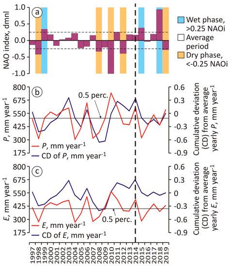 For natural years 1997–2019 in the SAL area, (a) normalized North Atlantic Oscillation (NAO) index (purple bars) [NAO website: http://www.cpc.ncep.noaa.gov/]; (b) annual precipitation (P) time series from Sines meteorological station and cumulative deviation (CD) from average annual P, mm year−1; and (c) annual actual evapotranspiration (E) time series from Sines meteorological station and CD from average annual E, mm year−1. For (b,c), the average (0.5 percentile) of yearly data series is indicated. Vertical dotted line indicates the study year 2014.