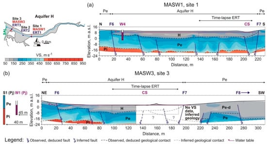 MASW1 and MASW3 surveys at sites 1 (a) and 3 (b), respectively. A preliminary geological interpretation of VS values is included, showing projected (Pj) log of geotechnical sounding S1 after [40], and water table recorded in September 2014 in wells W4 (site 1) and W1 (site 3) as in Figure 4. Profiles are topographically corrected and its vertical-to-horizontal scale ratio is 1:1. CS, Cascalheira Stream; H, Holocene; Pe, Pleistocene; Pe-d, Pleistocene sand dunes; Pi, Pliocene; and F1 to F3, NW–SE strike-slip faults. The dotted-line rectangle is the area covered by time-lapse ERT surveys at sites 1 and 3.
