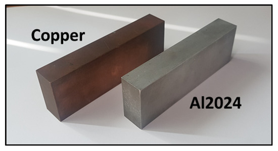 To verify the proposed method, two kinds of specimens with different materials, pure copper and aluminum (Al2024), were prepared as shown in Figure 1. The dimensions of both the specimens were same at 120 mm × 40 mm × 20 mm. Aluminum was used as the reference material and copper was used as the test material.