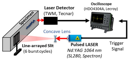 The experimental scheme for the relative acoustic nonlinearity measurements using the fully non-contact surface acoustic wave method is shown in Figure 2. A pulsed Nd:YAG laser beam of 1064 nm (SL280, Spectron Laser Systems, Warwickshire, UK) was used to excite surface acoustic waves. The pulse duration of the pulsed laser is 10 ns, the repetition rate is 10 Hz, and the maximum energy is 300 mJ. A line-arrayed slit mask was designed to create surface acoustic waves with a wavelength of 2.92 mm, which corresponds to the fundamental frequency of 1 MHz in aluminum and 0.75 MHz in copper. The duty ratio of the slit mask was 50%, which theoretically does not generate a second harmonic component [12].