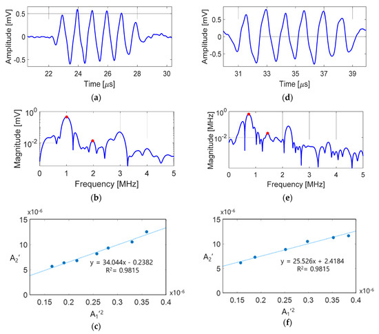 The received surface acoustic wave signals, their frequency spectra, and the linear fitting plots of A1′2 and A2′ are shown in Figure 3 for aluminum and copper specimens. Figure 3a–c shows the results of the aluminum specimen and Figure 3d–f shows the results of the copper specimen. The surface acoustic wave signals shown in Figure 3a–d were obtained at the highest laser intensity, and Figure 3b–e shows their frequency spectra. The magnitudes of the fundamental and second-order harmonic frequency components are indicated by red dots. The fundamental frequency in aluminum was detected at 1.0 MHz and the second harmonic frequency was detected at 2.0 MHz, as intended. In copper, the fundamental frequency and second harmonic frequency components were detected at 0.74 MHz and 1.47 MHz, as expected.