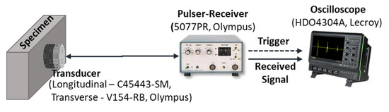 Pulser-receiver (Olympus 5077PR, Tokyo, Japan) and PZT transducers with main-resonance frequencies of 5.0 MHz for longitudinal waves and 2.25 MHz for transverse waves were used in the experiment. Figure 4 shows the experimental setup for wave velocity measurement. The TOF between the echo signals was measured using the auto-correlation of the received signal [21]. By using the measured TOF and thickness of the specimen, the velocities of the longitudinal and transverse waves were calculated for each specimen.
