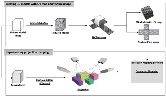 The proposed framework of BIM-based SAR for building design prototyping consists of two main parts (see Figure 2). The first process is creating virtual and physical 3D models, UV maps, and texture files. The next process is projection mapping implementation, which transforms videos or images into interactive displays on a target surface.