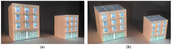 The relative angle between the mass models and the projector were changed by rotating the models horizontally (see Figure 6). This session illustrates the influence of tangential distortion (keystoning) when the projected object has an angled surface. The projector was placed to throw the images more parallel to the front wall of the building model in a horizontal direction (as shown in the right side of Figure 6). When the building model was rotated horizontally to a certain angle (as presented in the left side of Figure 6), differences in projection could be detected. From the displays on the frontal wall of the building, the details seemed blurrier after rotation. Moreover, the relatively big difference caused by tangential distortion could be found in the flank wall, where the texture of the wall was projected much more clearly on the left-hand side in the figure.