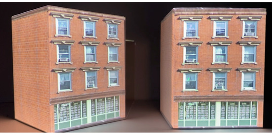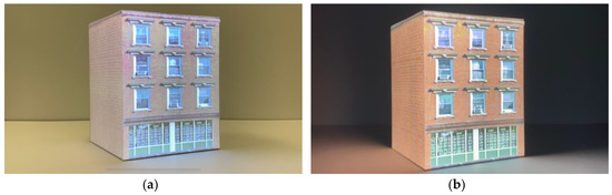 Two types of illumination conditions were simulated: with background light and without background light (see Figure 5). The biggest influence of lighting conditions on the projected image was color. The virtual image appeared to be closest to the original color scheme when the projection did not have background lighting. There was a higher degree of color contrast in the darker environment (no background lighting), especially on the lines and ridges of the model, such as the brick seams and window frame edges, which gave the projected model more depth and a stereoscopic effect.