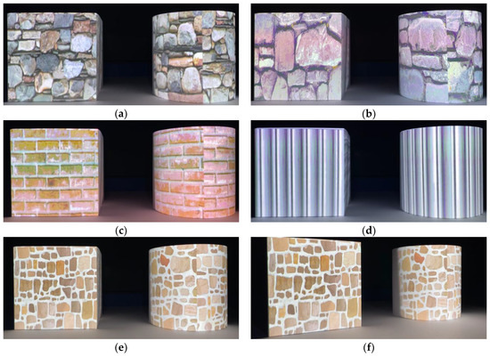 The planar and curve projection surfaces were tested in order to be compared. The tested models were made as a cylinder type and cube type by applying several textures of building materials on it (Figure 7). The typical building textures, such as brick, stone, and column pattern were projected on both planar and curved surfaces. On the curved surface, there was a distortion issue, which affected the level of texture definition and slightly changed the design. Furthermore, there were discontinuous areas of the texture on the curved surface, but this was caused by the discontinuous part of the cylinder flank on the UV map. Likewise, the curved surface wrapping around the object might need to be separately placed on the UV map, which will lead to the discontinuity in texture. Moreover, on the transitional area of the curved surface that cannot be projected on (Figure 7f), there was huge distortion, and the pixel quality deteriorated extremely close to the edge lines.