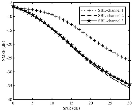The performance of blind channel estimation of SBL is verified by simulation, the multipath length of three outputs is assumed to be 900 sampling points. We use normalized mean square error (NMSE) to evaluate the performance of SBL channel estimation.