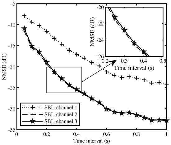Figure 2 shows the estimated CIR of the three channels. Figure 3 shows the difference between the original CIR and the CIR estimated by SBL. The first 900 sampling points correspond to channel 1, the 901–1800 sampling points correspond to channel 2, and the 1801–2700 sampling points correspond to channel 3. Figure 4 shows the NMSE of three channels. Refer to Figure 2, Figure 3 and Figure 4, by using SBL, we can achieve the estimation of underwater acoustic sparse channel accurately with the increase of SNR. In addition, we also simulate the performance of channel estimation under time-varying channel. We set the simulation SNR to 20 dB. After each time interval, we can achieve 100 groups of random sparse channels [21], and then we use the proposed method to estimate these channels. Finally, we take the average to be the result as it is shown in Figure 5. From Figure 5, we can find that channel estimation accuracy is low as the channels’ NMSE is higher than −10 dB when the time interval is 0.05 s or lower than 0.05 s. By contrast, the channels’ NMSE is lower than −20 dB when the time interval is higher than 0.2 s, which shows that the method proposed in this paper is still effective when the time interval is about 0.2 s. Refer to Figure 4 and Figure 5, due to the constraints that we set , the gain of channel 1 achieved by channel estimation cannot be further eliminated. Therefore, we can know the estimation of channel 2 and channel 3 are more accurate than channel 1.