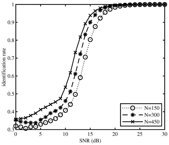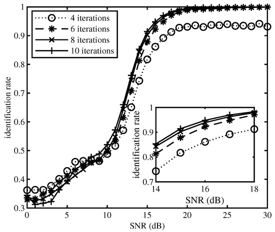 The influence of different iteration times on the performance of EM method is analysed by this simulation. We set the number of symbols of EM to 300 and the iteration times of EM to 4, 6, 8, and 10 respectively. Figure 7 is the identification rate curve of iteration times under different SNR, and we can find the identification rate is relatively better When iteration times is 8 and 10. Besides, taking the amount of computation into consideration. Therefore, we set iteration times to 8. Based on the above analysis, we can simulate the influence of different number of symbols on EM when the iteration times is 8. We set the number of symbols to 150, 300, and 450, respectively. The Figure 8 showed that the more the symbol number is, the better the identification rate is. When considering the amount of computation, we set the number of symbols to 300 finally.