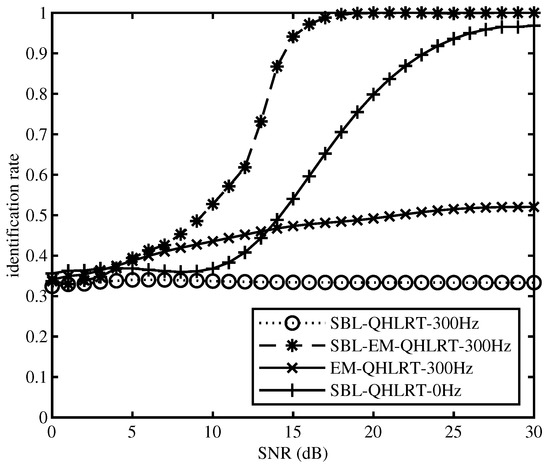 In the end, we compared the identification rate by using SBL-QHLRT with frequency offset and without frequency offset, also by using EM-QHLRT without SBL and SBL-EM-QHLRT. As shown in the Figure 9 (here we have set EM iteration times to 8 and the number of symbols to 300). SBL-QHLRT with frequency offset cannot identify MPSK modulation successfully because the constellation rotation will make the QHLRT failed. EM-QHLRT also failed to identify MPSK modulation because EM is only suit for flat fading channel. SBL-QHLRT method with known original constellation and have no frequency offset can be useful, but it will be affected by channel estimation error. We can apparently find that SBL-EM-QHLRT can overcome the problem of constellation rotation and reduce the influence of underwater acoustic fading channel. Figure 10 shows the identification rate of BPSK, QPSK, and 8PSK under SBL-EM-QHLRT, of which BPSK has the highest identification rate and 8PSK has the lowest.